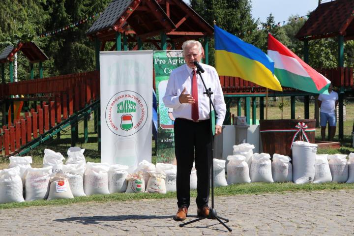 – Tizenkettedik alkalommal gyűlünk itt össze, hogy a Magyarok Kenyere kezdeményezésre összeöntsük azt a búzát, amit gazdáink adományként felajánlottak, és reményeink szerint augusztus 20-a táján ki fog sülni belőle a világ legjobb, foszlós bélű, ropogós héjú kenyere – kezdte köszöntőjét Hidi László, a „Pro Agricultura Carpatika” Kárpátaljai Megyei Jótékonysági Alapítvány elnöke és röviden visszatekintett az elmúlt évre, arra, hogyan termett meg az idén a termés. Szólt a 2022 februárja óta tartó honvédő háborúról, amelyet Ukrajna a betört orosz ellenség ellen vív, s amely minden anyagi és emberi erőforrást felemészt, ezzel erősen kihatva a hátországra is. Kitért a kárpátaljai gazdaságoknak adott sokéves tanácsra: több lábon kell állni. Erre az idei év is rámutatott, a májusi kemény fagyokkal, a júliusi szörnyű viharkárokkal.